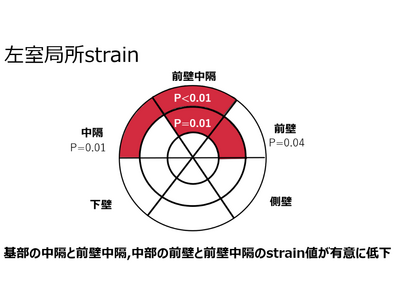 また、これら心機能障害を有する小児がん経験者では心臓超音波検査結果の中でも潜在性の心機能障害を発見できるとされている左室長軸方向ストレイン5)値が低下していました。中でも、左心室の前側(心室中隔)のストレイン値が低下しており、限局的な心臓の筋肉の障害が明らかになりました。この左室ストレイン値は左室駆出率が低下する前に低下するため、心機能障害の早期発見に役立つ可能性が示されました。