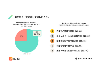 B/43広報事務局より、11月22日「いい夫婦の日」に合わせて行った「夫婦関係」をテーマにしたアンケート調査の結果をまとめたニュースレターをお送りいたします。調査は、一般的なネットアンケートで集めた既婚女性306人と、ペア口座「B/43 ペアカード」を利用している既婚女性264人を対象に行いました。