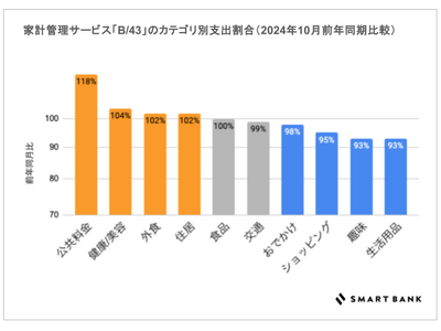 家計管理サービス「B/43(ビーヨンサン)」を提供する株式会社スマートバンクは、総務省が本日12月6日に発表した最新の家計調査結果を受け、支出カテゴリごとの増加率と減少率を調査しました。