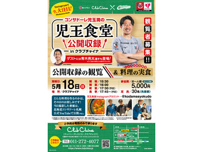 ご自身のInstagramで数々の手料理をご披露されている児玉選手が実際に調理する様子や、体づくりに配慮したこだわりのレシピを見られる「児玉食堂」は、北海道コンサドーレ札幌公式YouTubeで公開されているお料理コンテンツ。その様子を一足先にご覧いただける公開収録を、5月18日(日)にレストラン クラブチャイナで行います。