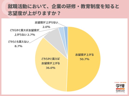 就職活動において、企業の研修・教育制度を知ると「志望度が上がる」と回答した学生は50.7%。「どちらかと言えば志望度が上がる」36.0%を合わせると、86.7%を占め、9割近い学生が研修・教育制度を知ると志望度が上がるとしています。「安心」につながるとの声が多く、入社後の「イメージが湧く」という学生も。「自己成長できる環境」「将来設計に役立つ」「自分自身の価値を高めることができ、転職にも有利に働く」との声もありました。