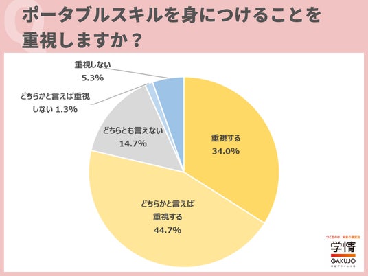 株式会社学情(本社:東京都中央区)は、2026年3月卒業(修了)予定の大学生・大学院生を対象に、「ポータブルスキル」についてインターネットアンケートを実施しました。約8割の学生がポータブルスキルの習得を重視すると回答。「部署異動や転職のときに役に立つ」「様々な業界で必要な人材になれる」など、将来の転職を見据えた声が多く寄せられました。また、就活で企業の研修・教育制度を知ると志望度が上がるとの回答は9割近くを占めました。研修・教育制度を知ると「安心」と書いた学生が多く、入社後の「イメージが湧く」との声もありました。