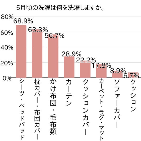 最も多かったのは「シーツ・ベッドパッド」(関東68.9%・全国77.6%)でした。続いて「枕カバー・布団カバー」(関東63.3%・全国71.5%)・「掛け布団・毛布類」(関東56.7%・全国66.5%)が並び、トップ3は全て寝具類で、この3つを洗濯する方がそれぞれ半数を超えました。5月は冬物など厚手寝具をしまうのに良いタイミングであり、そのことも影響して洗濯する方が多いようです。
