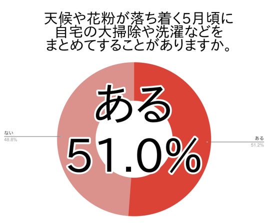 アンケートでは、天気や花粉が落ち着く5月頃に自宅の大掃除や洗濯などをまとめてすることがあると答えた方は約5割(関東51.2%・全国51.0%)でした。