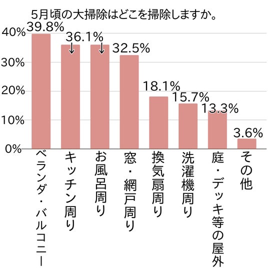 最も多かったのは「ベランダ・バルコニー」(関東39.8%・全国35.1%)でした。他にも屋外に関する箇所として「窓・網戸周り」(関東32.5%・全国33.2%)・「庭・デッキ等の屋外」(関東13.3%・全国19.8%)がありました。カラッと晴れた日が多い5月、梅雨や本格的な暑さ・虫が多くなる前の時期にベランダや庭など外掃除をする方が多いようです。