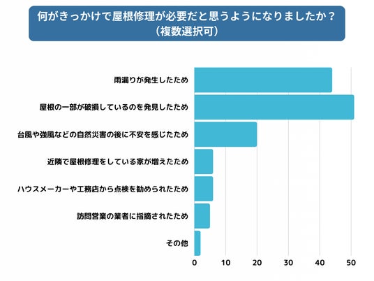 屋根修理を考えたきっかけで最も多かったのは、「屋根の一部が剥がれたり、破損しているのを発見したため」(51件)や「雨漏りが発生したため」(44件)といった、目に見えるトラブルによるものでした。