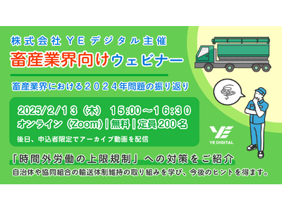 株式会社YE DIGITALは、この度、飼料メーカー、飼料配送業者、畜産農家の皆さまを対象に、『畜産業界における2024年問題の振り返り~飼料流通の取り組み~』ウェビナーを2025年2月13日(木)に開催いたします。