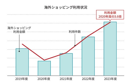 2016年1月の Sony Bank WALLET 取り扱い開始以来、発行枚数の増加とともに、海外ショッピングの利用も増加していましたが、新型コロナウイルスの影響により、2020年度の海外利用が減少しました。2021年度から徐々に回復し、2023年度には利用金額が2020年度の3.6倍まで増加しました。Sony Bank WALLET 利用口座のうち2023年度の月間海外ショッピング利用率は約25%を占め、2023年11月には海外ショッピング累計利用額は1,000億円に達しました。