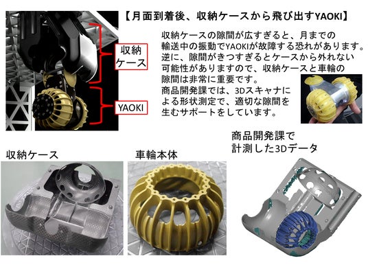 今回のYAOKIの初月面ミッションに際し、パンチ工業では、3Dスキャナによる3D形状測定技術を活用し、YAOKI本体のフライトモデルおよびデプロイヤー(YAOKI輸送用のケース)の最適な隙間(クリアランス)設定のサポートを行う他、打ち上げに際してYAOKIが求められる品質保証要件を満たすことで、打ち上げの土台作りに貢献しました。