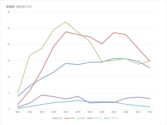 次に、各国におけるグラントの件数の年次推移を図4に、配賦金額の推移を図5に示します。ただし、中国はグラントデータの開示状況が年によって大きく異なり、実態を反映していない可能性が高いため除外しています。また、公開直後のグラント情報にはデータベースに格納されていないものもあるため、直近の集計値は過小評価されている可能性があります。