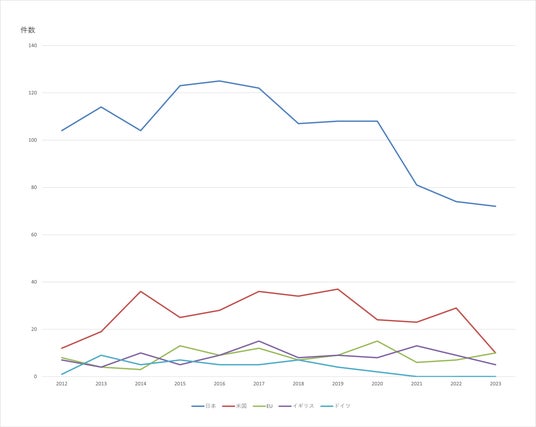 図4:2012年から2023年における有機EL・フレキシブルディスプレイに関するグラントのプロジェクト件数推移(上位5か国)