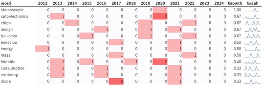 出現回数の総数は大きくないものの、近年で増加の傾向にある語は「chips」や「design」など製品に関するものや、「full-color」など光学関連のキーワードが抽出されました。これは、有機ELやフレキシブルデバイスの構造・設計に注目し、色の表現など性能に優れた製品を開発することが目的と考えられます。また、「energy」や「consumption」など、消費電力やエネルギーに関連する用語も抽出されており、省エネルギー化に向けた開発が注目されていると推察されます。成長率は減少傾向ですが、「foldable」の出現頻度も大きく、折りたたみ可能なディスプレイなどの製品化がすでに推進されていることがわかります。