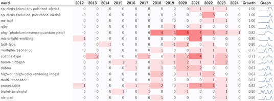出現頻度が高く、かつ近年で頻度が増大しているキーワードとして、材料の発光効率を意味する「PLQY」や、演色性を意味する「high-CRI」など、光学的機能に関する用語が抽出されています。そのほかに出現頻度の高い用語の「coating-type」や「processable」は、材料・デバイスの構造やプロセスに関係しています。これらのキーワードは、半導体デバイスの製造プロセスにおけるコーティング加工の特性や、溶液処理の活用が注目されていると考えられます。材料の性質や作製プロセスなど、基礎的観点から高性能デバイスを開発する需要が根強いことが推察されます。