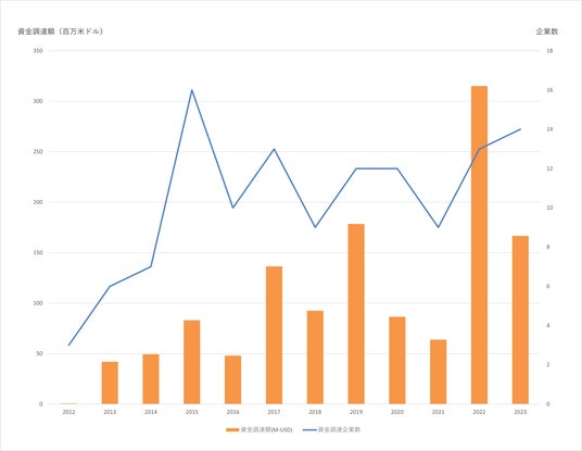 資金調達企業数と調達額ともに増減を繰り返していますが、件数は2015年以降、減少から横ばいの傾向に対し、調達額は中長期的には上昇トレンドにあります。とくに、2022年は件数に対して調達額の伸びがいちじるしく、1件あたりの調達額が大きい企業が出てきています。3次元的な立体像やVR・ARなどへの展開に多額の資金調達を実施する企業が増えているためと考えられます。