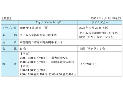 パーク24株式会社(本社:東京都品川区、社長:西川光一)は、株式会社京都銀行(本店:京都府京都市、頭取:安井幹也)が新たに開業した「京都フィナンシャルグループMUKOUビル(以下、「MUKOUビル」)」の来客用駐車場において、パーク24グループの時間貸駐車場「タイムズパーキング」およびカーシェアリングサービス「タイムズカー」のEVを展開し、京都銀行の脱炭素化の取組みに貢献します。