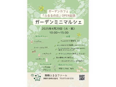 京都府舞鶴市の人気スポット「舞鶴ふるるファーム」に、四季折々の豊かな自然の中で、海を眺めながらミニパフェやケーキなどのスイーツやドリンクを楽しめる「ガーデンカフェふるるの丘」が令和7年4月29日(祝)にグランドオープンします。四季折々の美しい自然に囲まれた広大な公園で、こだわりのスイーツやドリンクを片手に、あったかほっこり心安らぐひとときをお過ごしください。