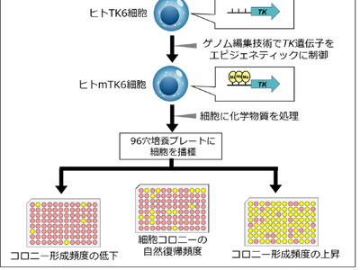 TK6試験は、ハウスキーピング遺伝子(注7)TKをレポーター遺伝子(注8)として、遺伝子配列に生じる突然変異を検出する方法です。本研究では、ゲノム編集技術を用いてTK遺伝子のエピジェネティックな制御を可能にした細胞株「mTK6」を樹立しました。この細胞株では、外因性のエピジェネティックな作用がTKの表現型に反映され、コロニー形成(注9)に影響を与えます(図1)。