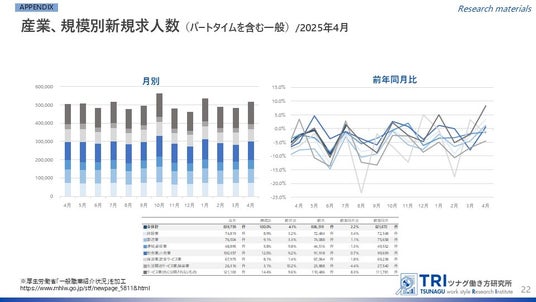 株式会社ツナググループ・ホールディングス(本社:東京都中央区、代表取締役社長:米田 光宏)を母体とする、多様な働き方の調査研究機関「ツナグ働き方研究所(拠点:東京都中央区、所長:大野 博司)」は、官公庁などが発表する労働市場関連のデータをキュレーションしつつ、分かりやすくまとめた「労働市場データレポート」を毎月発表しています。今回は5月下旬に発表された最新データをもとに2025年4月度のレポートについて、とりまとめましたのでご報告いたします。