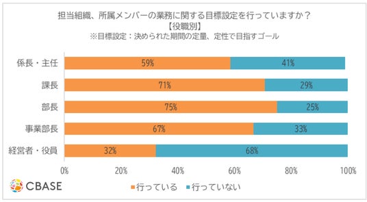 役職別に見てみると、目標設定を行っていると回答した割合が最も多いのは「部長」で75%となりました。次いで「課長(71%)」「事業部長(67%)」と続きます。最も低いのは「経営者・役員」で32%となり、管理職に向けたマネジメントとメンバー層へのマネジメントでは行っているコミュニケーションや時間の使い方に差異があることが明らかになりました。
