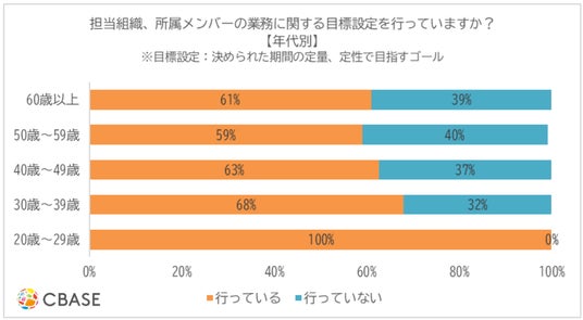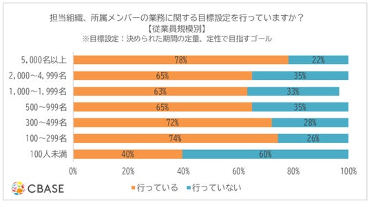 従業員規模別に見てみると、100人未満の規模で目標設定を「行っている」割合は4割となり、他の規模よりも著しく低いことがわかりました。規模の小さな企業では、切り分けた業務や個人の目標設定を行うよりも、総合的に事業運営に携わるスタイルで組織運営をしている様子が想像できます。