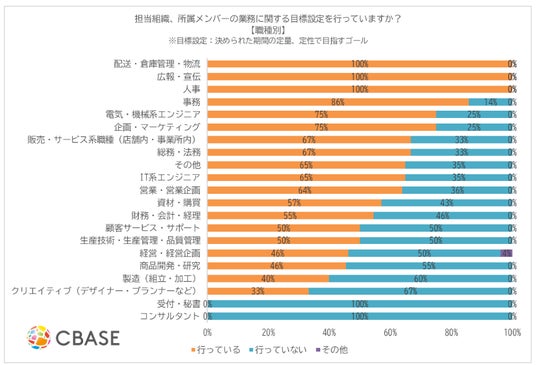 職種別に見てみると、「人事」「広報・宣伝」「配送・倉庫管理・物流」「事務」「電気・機械系エンジニア」「企画・マーケティング」などの職種の75%以上から、目標設定を行っているという回答を得ました。