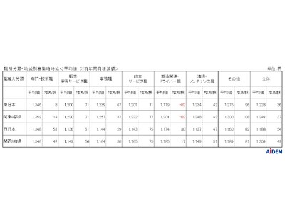 職種大分類別の平均時給は、「専門・技術職」1,346円(前年同月比47円増)、「製造関連・ドライバー職」1,185円(同17円増)、「飲食サービス職」1,165円(同75円増)、「事務職」1,164円(同36円増)、「販売・接客サービス職」1,149円(同56円増)、「清掃・メンテナンス職」1,149円(同51円増)の順で、前年同月比で全ての職種がプラスとなった。府県別の平均時給は、大阪府1,232円(前年同月比41円増)、京都府1,179円(同71円増)、兵庫県1,161円(同45円増)の順となり、前年同月比で全ての府県がプラスとなった。