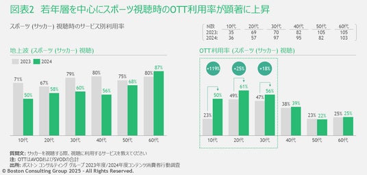 調査では、10代のサッカー視聴時のOTT利用率は2023年時点では23%だったのに対し、2024年では50%となるなど、若年層を中心にOTTでのスポーツ視聴率は上がっています(図表2)。