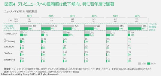 各ニュースメディアにおける信頼度を聞いたところ、選挙報道やテレビ局のコンプライアンス問題への関心が高かった時期(2025年1月)に調査を実施したことも影響し、テレビニュースへの深刻な信頼低下が示されました。信頼度は全世代で低下しましたが、特に若年層において顕著です(図表4)。