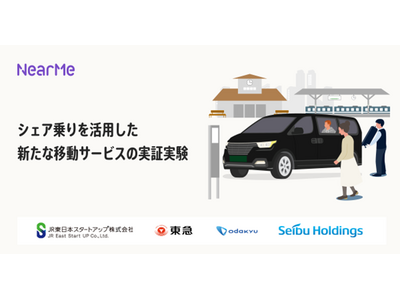 - 東日本旅客鉄道株式会社のグループ会社でベンチャーへの出資・協業を推進するCVCのJR東日本スタートアップ株式会社、東急株式会社、小田急電鉄株式会社、株式会社西武ホールディングスで構成される鉄道横断型社会実装コンソーシアム「JTOS(ジェイトス)」第五弾共創として、移動の課題に取り組むソーシャルデザインカンパニーである株式会社NearMe(以下、ニアミー)と連携し、移動の「もったいない」を解決し、1人でも多くの人が、自由に移動できる社会の実現に向けて“シェア乗り”を活用した新たな移動サービスの実証実験を行います。