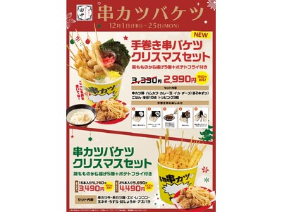 昨年大好評だった串カツバケツのクリスマスセットが、今年は2種類登場!パーティにピッタリな「串カツバケツ」&「手巻き串バケツ」と、お子様に大人気な『鶏もものから揚げ』と『ポテトフライ』がセットになっており、まさにクリスマスシーズンにピッタリなワクワクした内容となっております。