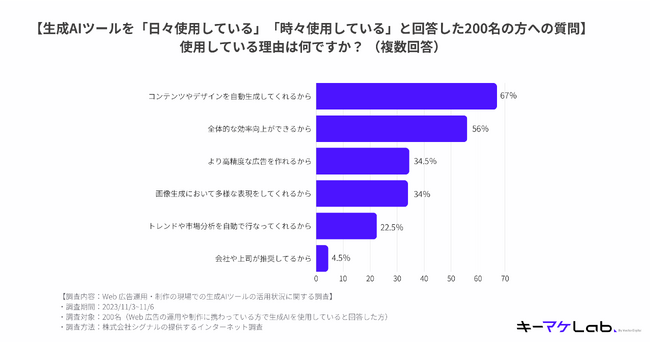 Web広告運用・制作の現場で「生成AIツール」を使用していると回答した人は40%。使用する理由は「コンテンツやデザインを自動生成してくれるから」が67%で最多。