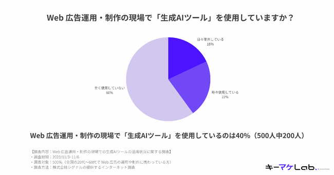 株式会社キーワードマーケティング(本社:東京都中央区、代表取締役:滝井 秀典、以下「キーワードマーケティング」)が展開するWebメディア「キーマケLab(読み:キーマケラボ)」は、日本国内でWeb広告の運用や制作に携わる方500名を対象に「生成AIツールの活用状況に関する調査」を実施しました。