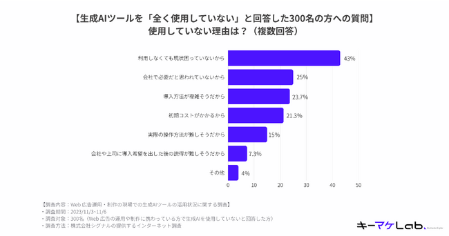 生成AIを全く使用しない人が「使用しない理由」は「現状困っていないから」が43%で最多に。23.7%が「導入方法が複雑そう」と回答。