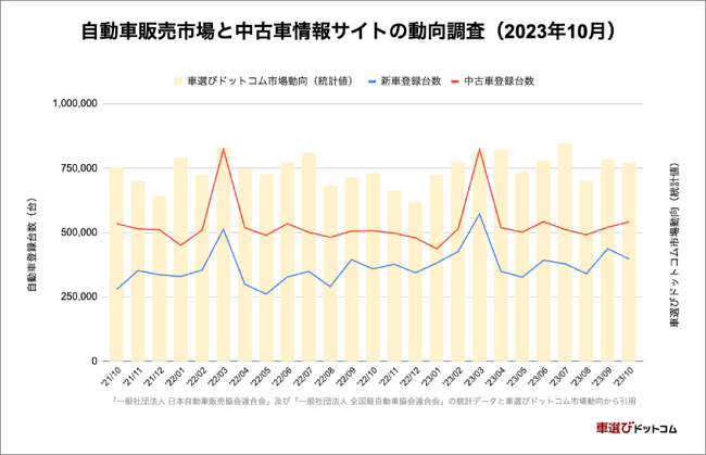 中古車情報サイト「車選びドットコム(https://www.kurumaerabi.com/)」を運営する株式会社ファブリカコミュニケーションズ(本社所在地:愛知県名古屋市中区、代表取締役社長CEO:谷口 政人)より、2023年10月における自動車登録台数の推移と、中古車情報サイト「車選びドットコム」の販売台数推移から、中古車市場の動きをまとめたレポートをご案内いたします。
