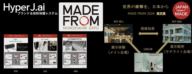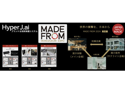 今回で3回目を迎えた本イベントは、地域独自の特性を活かした高品質な製品を生み出す力として、地域の文化や技術の重要性を認識すると同時に、持続可能な社会構築に寄与するイノベーションを推進する展示会として、経済産業省や日本商工会議所からも注目を浴びている展示会です。経済産業省からの委託事業として行われた「MADE FROM 2023」からさらなる進化を遂げ、いよいよ2023年12月1日より「MADE FROM 2024」が開催されます。今回、JAPAN MADE社からは、新たにトレーサビリティ機能を追加し、ブラッシュアップされた「HyperJ.ai」を、新規参加される5社へ、提供することが決定致しました。