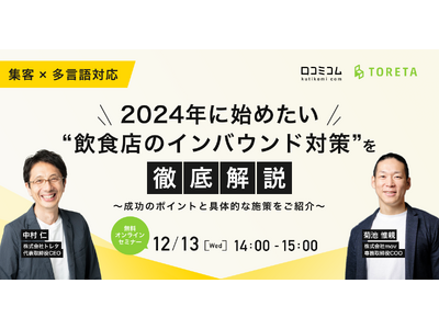 口コミサイトを”もっと”売上に変える、AI店舗支援SaaS「口コミコム」を運営する株式会社mov(代表取締役:渡邊 誠、本社:東京都渋谷区、以下mov)は、外食DXで飲食店の課題解決に貢献する株式会社トレタ(代表取締役CEO:中村 仁、本社:東京都品川区、以下、トレタ)と共催セミナーを開催いたします。日程は12月13日(水)14:00~15:00、参加費は無料です。