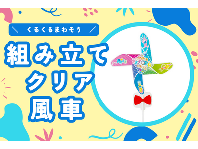 A5サイズの1枚のシートと付属パーツを組み立てて作る「組み立てクリア風車」を新商品として発表。全面フルカラー印刷可能で、イベントノベルティやワークショップ材料として最適なアイテム。