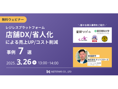 株式会社ネットスターズでは、3月26日(水)13:00より、ウェビナー「レジレスプラットフォーム ~店舗DX・省力化による売上UP/コスト削減事例7選~」を開催いたします。