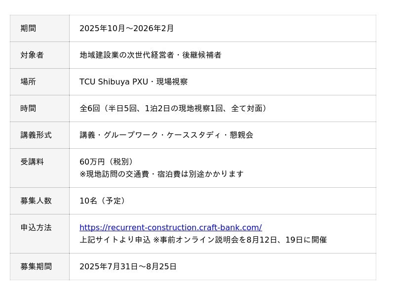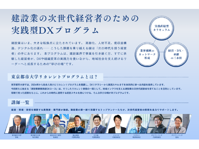 このたび開講する「建設業事業承継DXコース」は、同大学のDX人材育成に次ぐリカレントプログラムとして、地域インフラを支える建設業界における次世代経営者の育成を目的としています。