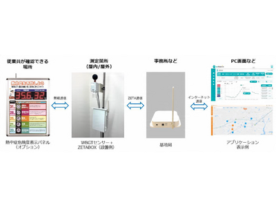 本ソリューションは、LPWA規格「ZETA」の特長を活かし、電波が届きにくい環境や複数拠点における熱中症リスクを可視化することが可能です。WBGT(暑さ指数)計とデータ変換機器「ZETABOX(TM)」を接続し、「e-Platch(TM)」アプリケーションにてデータの閲覧・一元管理・ユーザー設定の値を超えた場合のアラート通知ができます。また、表示パネルとの連携により、WBGT値と気温を現場でも可視化し、リアルタイムで熱中症リスクを確認することができます。これにより、作業環境におけるWBGT値や温湿度などの表示・常時監視・自動記録を可能にし、2025年6月1日に施行された改正労働安全衛生規則による熱中症対策の義務化に対応した従業員の安全確保、記録・管理などの業務効率化に貢献します。