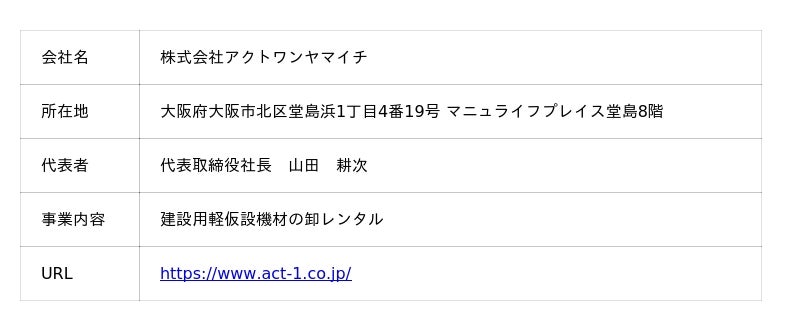 当社は、アクトワンヤマイチが掲げる「地球環境に配慮した建設用軽仮設機材の卸レンタル事業による社会貢献」をサポートしていくことで、社会インフラの整備、技術革新に対応した新技術の創出ならびに環境に配慮した循環型経済社会の実現に貢献してまいります。