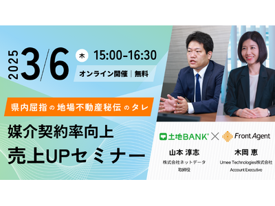 新人からトップセールスを輩出するコネクテッドセールス・プラットフォーム*「Front Agent」を開発・提供するUmee Technologies株式会社(本社:東京都調布市、代表取締役:新納 弘崇、以下「ユミー」)と不動産業界向けのネット情報サービスツールを開発する株式会社ネットデータ(本社:岡山県岡山市、代表取締役:松岡 明、以下「ネットデータ」)は、3月6日(木)15:00 - 16:30に共催オンラインセミナー「