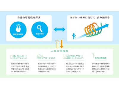 株式会社マイナビ(本社:東京都千代田区、代表取締役 社長執行役員:土屋芳明)は、従業員向けに新たな人事制度を導入しました。従業員のキャリア自律支援を目的として、「My WILL」と冠したプログラムを導入し、「My WILLシート(キャリアレジュメ)」「キャリアエージェント」「My WILLサポート(研修・ワークショップ)」の3つの施策を軸に、働きがいのある組織風土を醸成することを目指します。
