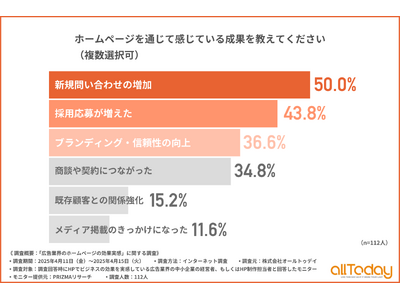 株式会社オールトゥデイ(本社所在地:埼玉県さいたま市)は、HPでビジネスの効果を実感している広告業界の中小企業の経営者、もしくはHP制作担当者を対象に、「広告業界のホームページの効果実感」に関する調査を実施しましたので、その結果を公表します。