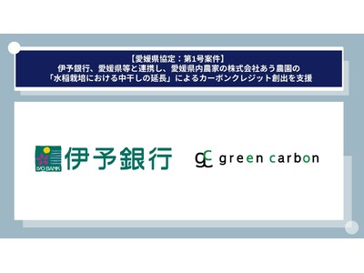 ネイチャーベースのカーボンクレジット創出販売事業を展開するGreen Carbon株式会社(代表取締役:大北潤、以下「Green Carbon(読み;グリーンカーボン)」)、株式会社伊予銀行(本社:愛媛県松山市、取締役頭取:三好 賢治、以下「伊予銀行」)、愛媛県等と連携し、愛媛県内水田農家の株式会社あう農園(代表取締役社長:有田 豊史、以下「あう農園」)の「水稲栽培における中干し期間の延長」によるカーボンクレジット創出支援を開始したことをお知らせします。