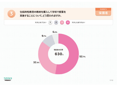 「包括的性教育の教材を購入して学校で授業を実施すること」について、85.1%の保護者が肯定的に回答するなど、学校における包括的性教育の実施を大きく後押しする結果に。