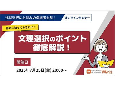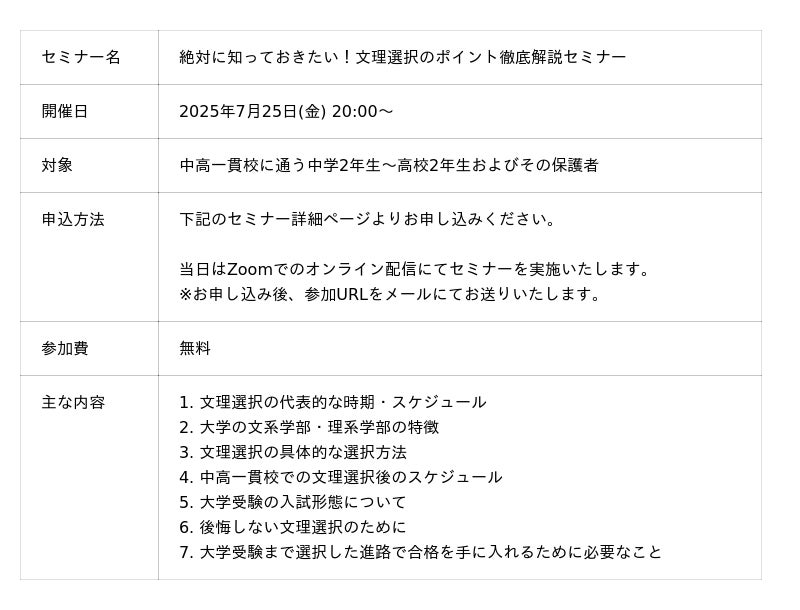 2025年7月25日(金)の20時より「絶対に知っておきたい!文理選択のポイント徹底解説セミナー」を開催いたします。