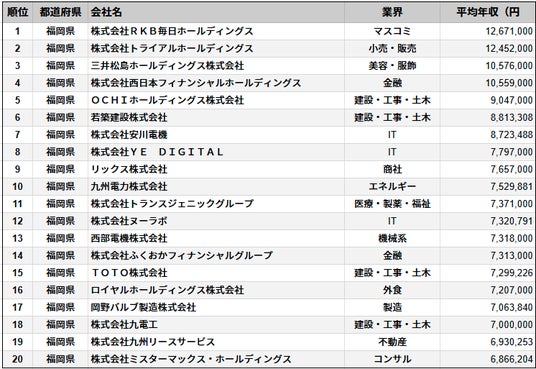 株式会社SalesNow(本社:東京都渋谷区、代表取締役:村岡功規、以下「当社」)は、国内540万社の企業情報を完全網羅した日本最大級のデータベース「SalesNow DB」より、上場企業を対象に福岡県に本社を置く企業の平均年収データを集計・分析し、「平均年収ランキング」として公開いたしました。