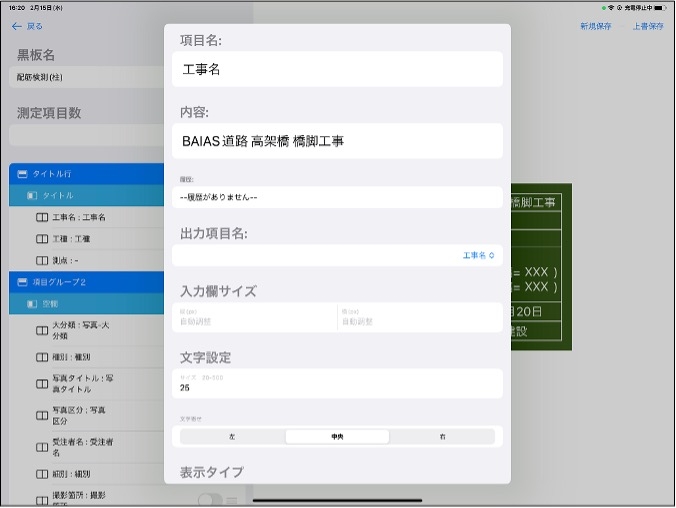 黒板内の各項目は、項目名(工事名や工種、測点等)、記載内容、入力欄のサイズ、文字サイズ、文字寄せ等の細かい設定が自由に設定でき、行および列単位でのレイアウトも自由に変更が可能です。