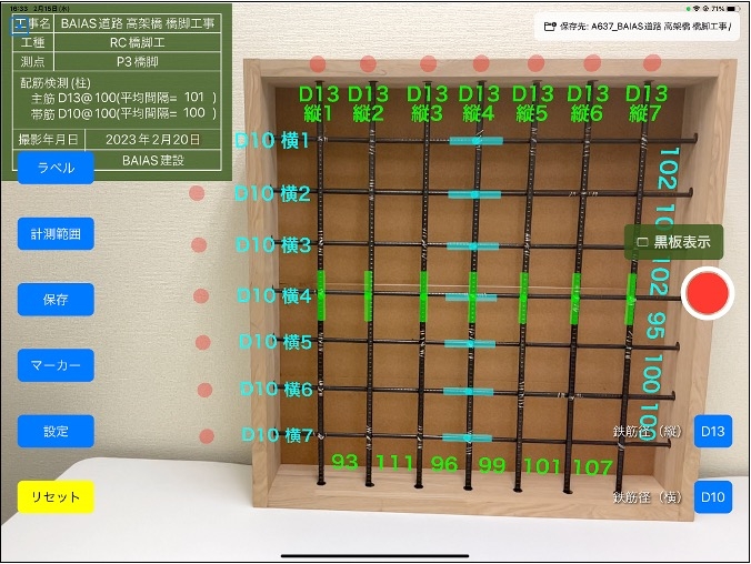 「BAIAS」はiPad Pro の LiDAR スキャナ機能により取得した鉄筋の点群データから配筋されている鉄筋情報を検知して、配筋間隔の計測を行い、撮影画像に配筋ラインおよび配筋間隔の数値をオーバーレイ表示するとともに、独自の画像解析処理により、12種類(D10~D51)の鉄筋径計測を行うことが可能です。加えて、保存された計測値・画像データをクラウドと同期することで、設計図と実際の配筋状況を比較可能な帳票を出力することが可能です。